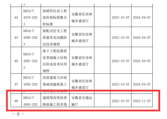 日前,從安徽省市場監(jiān)督管理局獲悉,由合肥路橋主持編制的安徽省地方標準《速熔型改性瀝青路面施工技術指南》(DB34/T 4583-2023)獲批發(fā)布,并將于2023年11月7日正式實施。